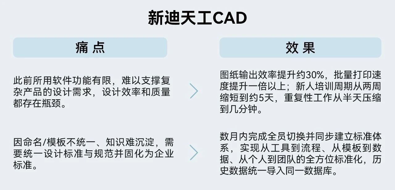 过去所用CAD软件虽然基本稳定,但在支持流程规范、团队协作与知识沉淀方面已难以适配企业的发展目标。以陈工的话说:“图纸命名、模板标准不统一,培训新人周期长,设计成果也很难沉淀下来。”