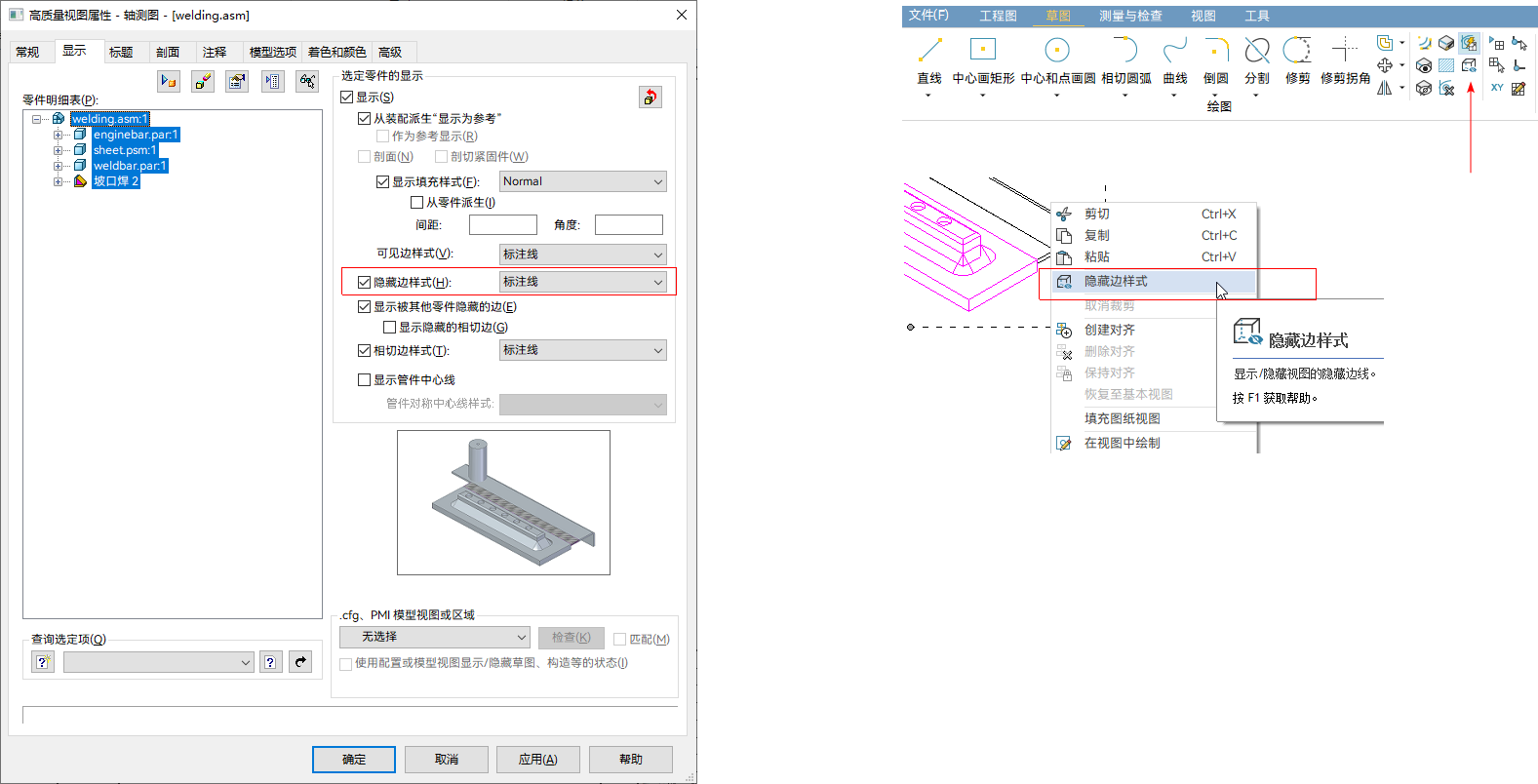 工程图视图的“隐藏边显示”新增快捷指令,方便用户快速切换。
