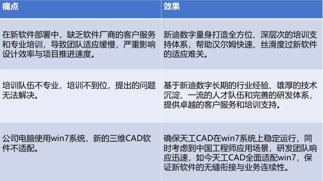 汉尔姆在发展早期就拥抱了某国产三维CAD软件,但因为该软件厂商的客户服务和专业培训的缺失,导致设计工程师团队适应缓慢,严重影响设计效率与项目推进速度,最终将其束之高阁。而汉尔姆所面临的挑战,正是制造企业在进行新旧软件更替时所面临的普遍困境。