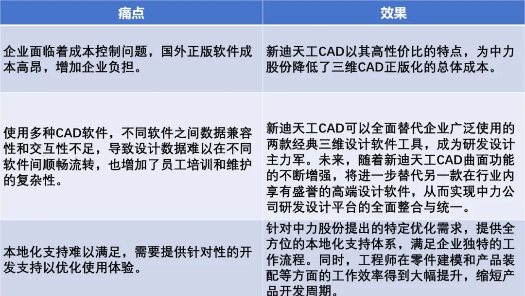 面对上述痛点问题,中力股份开始了对三维CAD软件厂商的全面调研和筛选。在这场寻找最佳合作伙伴的征途中,新迪数字及其新迪天工CAD软件以其独特的优势脱颖而出,成为中力股份的不二之选。双方的合作之路经历了三个重要阶段: