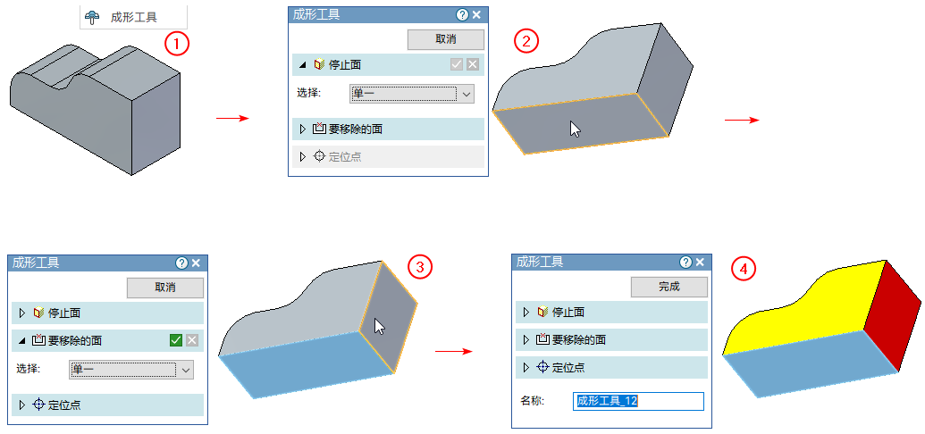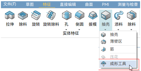 在钣金设计环境中,新增了“成形工具”命令,可以将零件造型定义为成形工具特征,成型工具特征保存到特征库后,可以作为冲压模具供钣金调用,这一功能极大地增强了定制化钣金设计的能力。