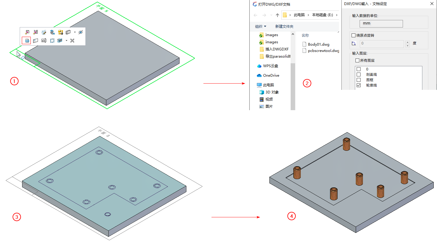 使用插入DWG/DXF命令,可以将 AutoCAD 文档(.dwg 或 .dxf)作为草图插入到指定平面。