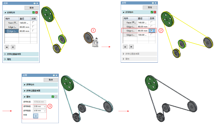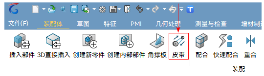 在装配环境中,新增皮带创建命令,用户只需选择皮带通过的皮带构件(如皮带轮、齿轮、转轮等)上的圆柱面或边,即可快速生成皮带,显著提升设计效率。