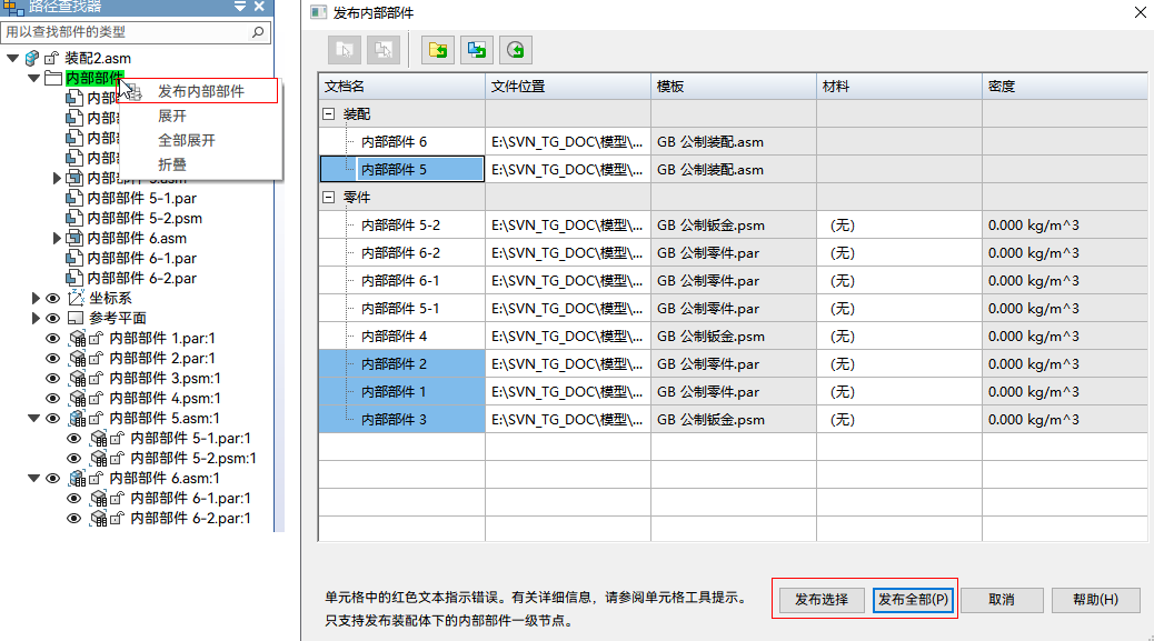 内部部件支持单选或多选发布,用户可自主选择一个或多个内部部件进行发布。以前,只能发布装配体中所有的内部部件。