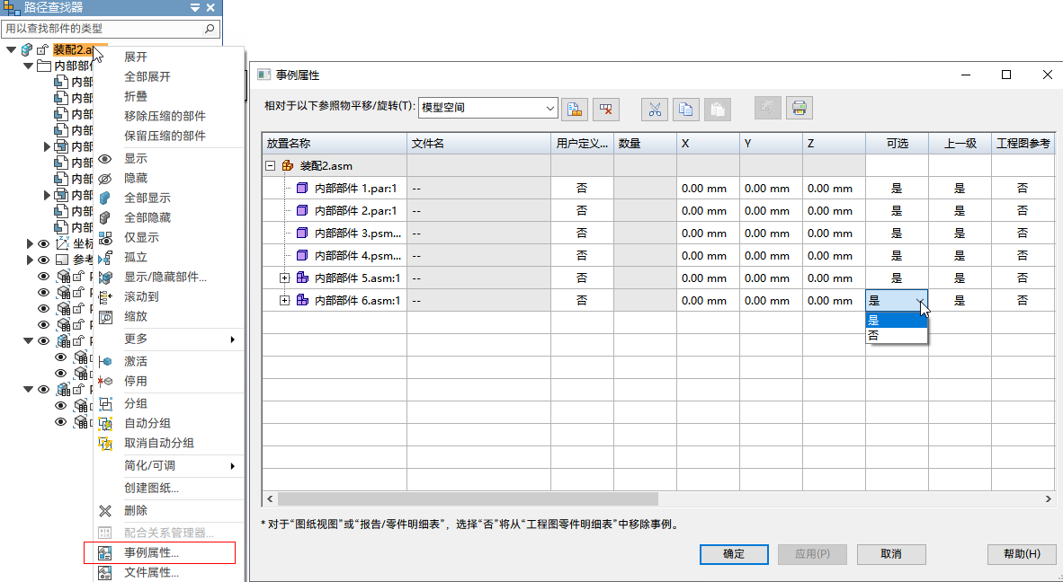 装配体中内部部件的事例属性可以像普通零部件一样修改和定制。