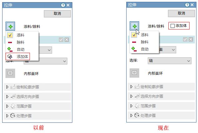 新增-顺序建模,拉伸、旋转增料时,将“添加设计体”作为复选框方式。顺序建模环境,拉伸命令条和旋转命令条上添加体选项的位置已调整。位置调整更直观,用户可按需选择是否添加设计体。