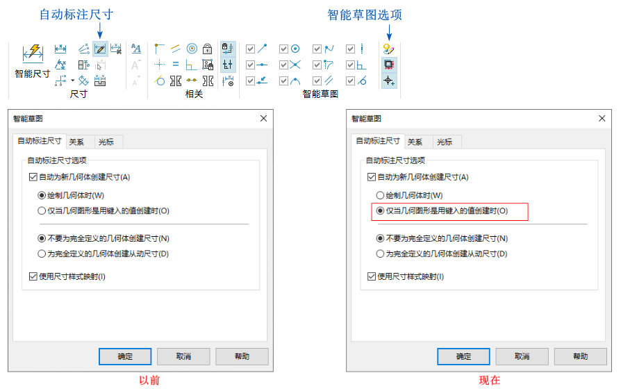 草图 - 智能草图选项中将“自动标注尺寸选项”的默认选项改为“仅当几何图形是用键入的值创建时”,减少不必要的标注干扰。