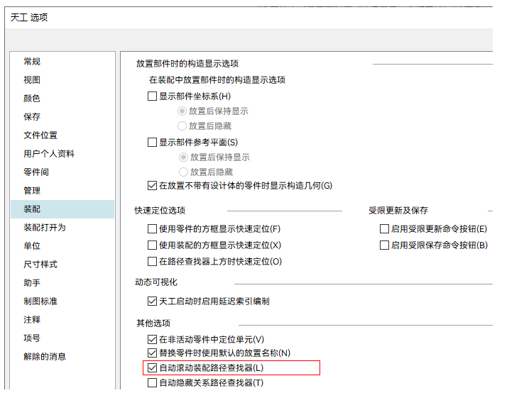 天工“选项“对话框中将”装配“卡下的”其他选项“ --> ”自动滚动装配路径查找器“选项默认设置为勾选状态。