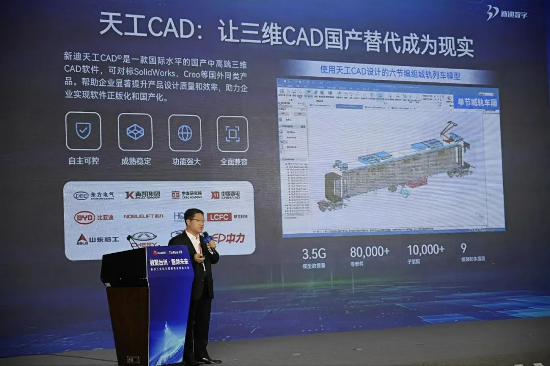 叶修梓博士介绍了新迪数字的核心产品——新迪天工CAD。新迪天工CAD是一款国际水平的国产中高端三维CAD软件,自主可控、成熟稳定、功能强大、全面兼容,帮助企业显著提升产品设计质量和效率,助力企业实现软件正版化和国产化,目前已在众多知名企业中实现了“真买、真用、真替代”。