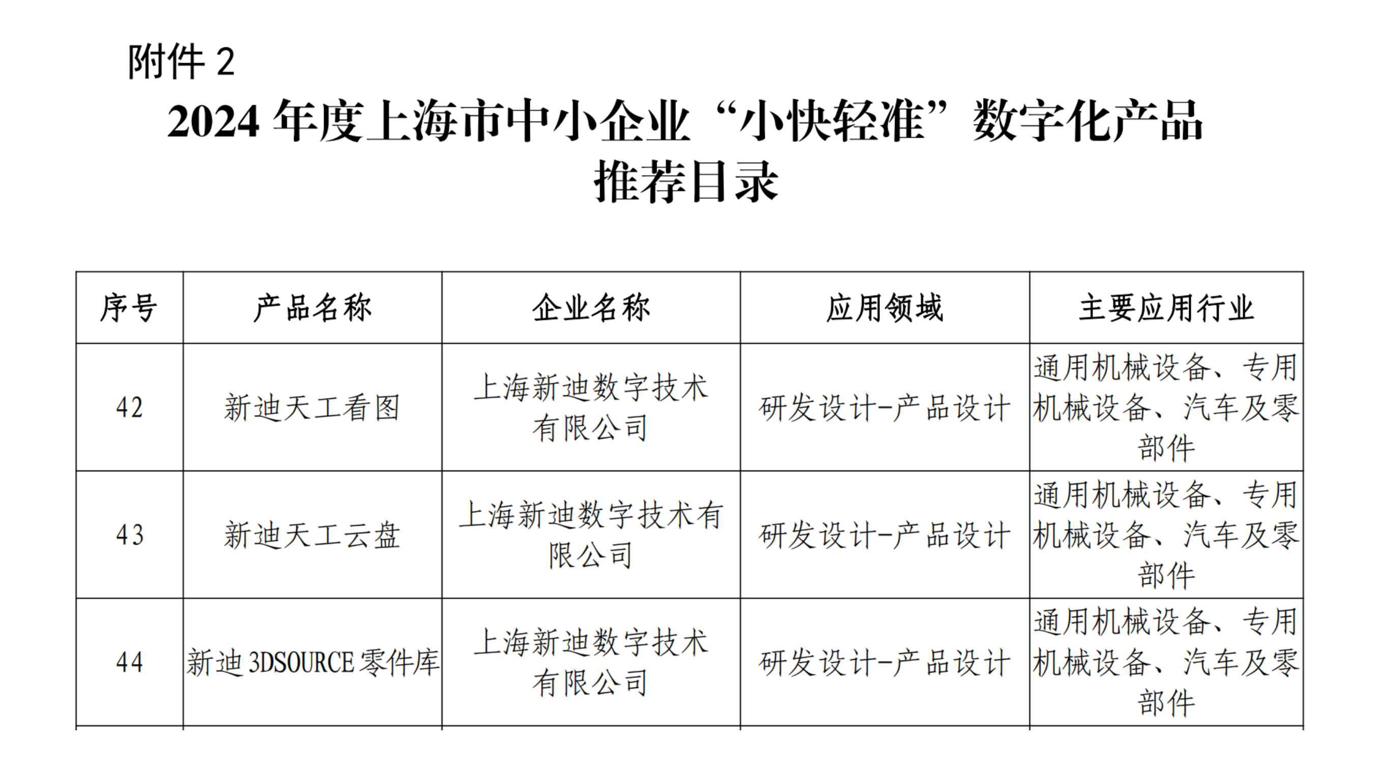 新迪数字创新产品新迪天工CAD、新迪3D轻量化引擎、成功入选《2024年度上海市制造业数字化产品和解决方案推荐目录》。该榜单中共有51家企业上榜,新迪数字上榜产品数名列前茅,展现了其在制造业数字化转型领域的领先地位和广泛认可。