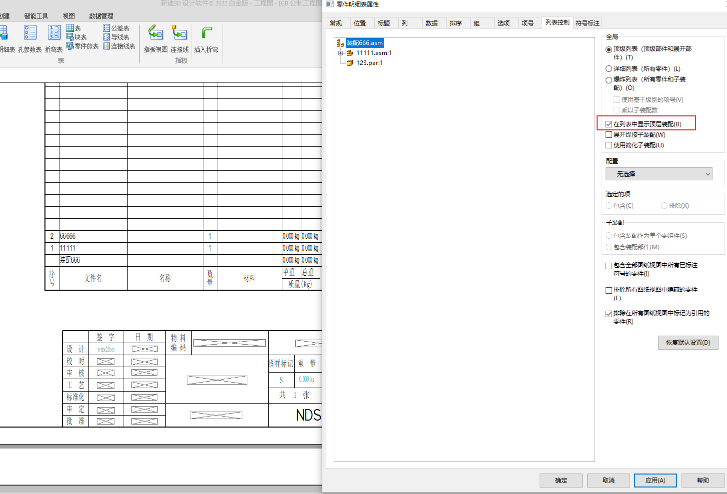 鼠标右键单击明细表,选择属性,切换到列表控制,勾选在列表中显示顶层装配。