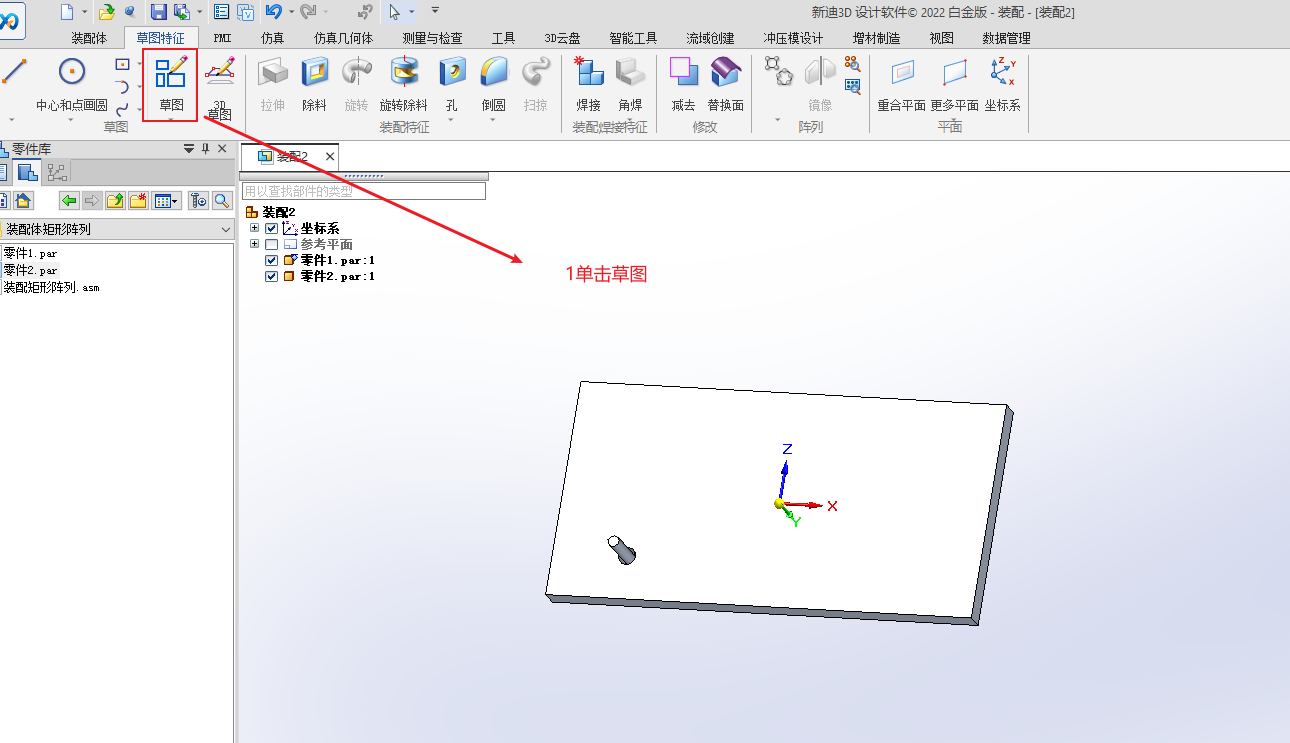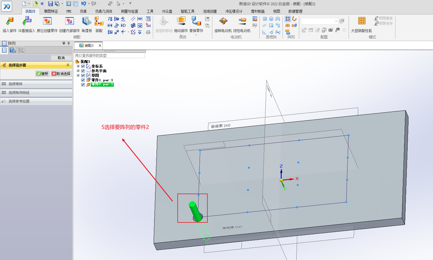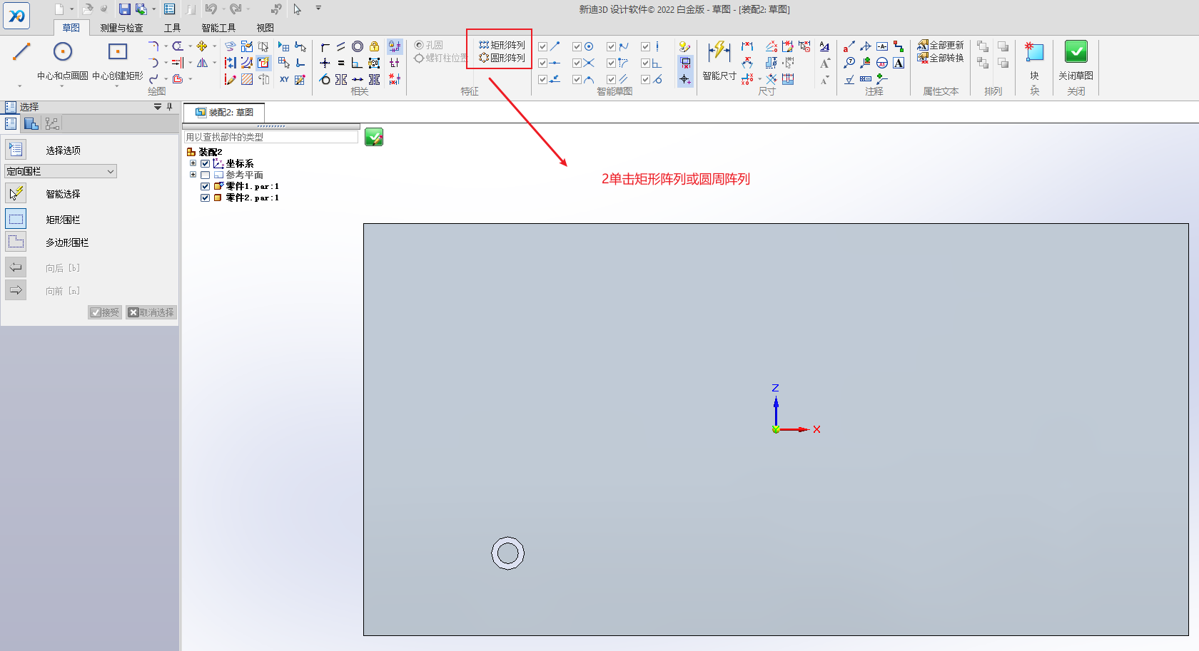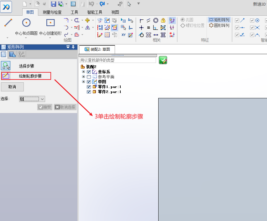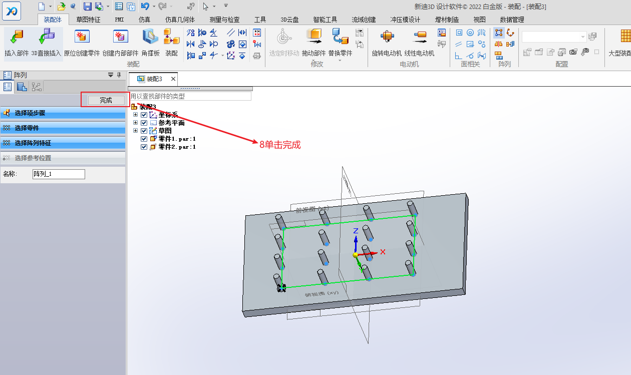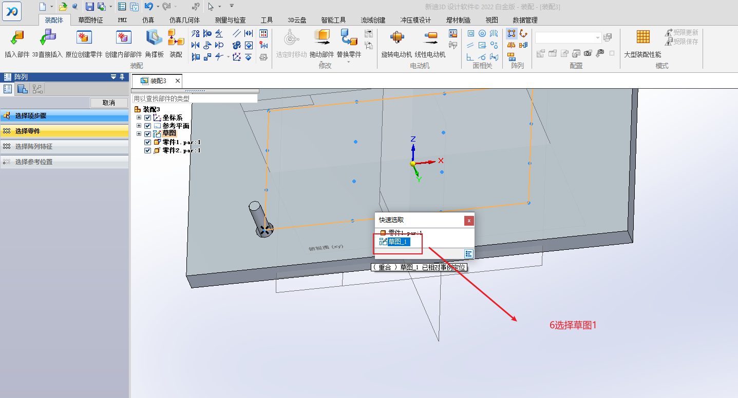 先绘制草图,选择圆周或矩形阵列,单击绘制草图轮廓,绘制完成后,关闭。切换到装配选项卡,单击阵列,选择要阵列的零件,再选择绘制的草图轮廓,参考特征也选择绘制的草图轮廓,单击完成。