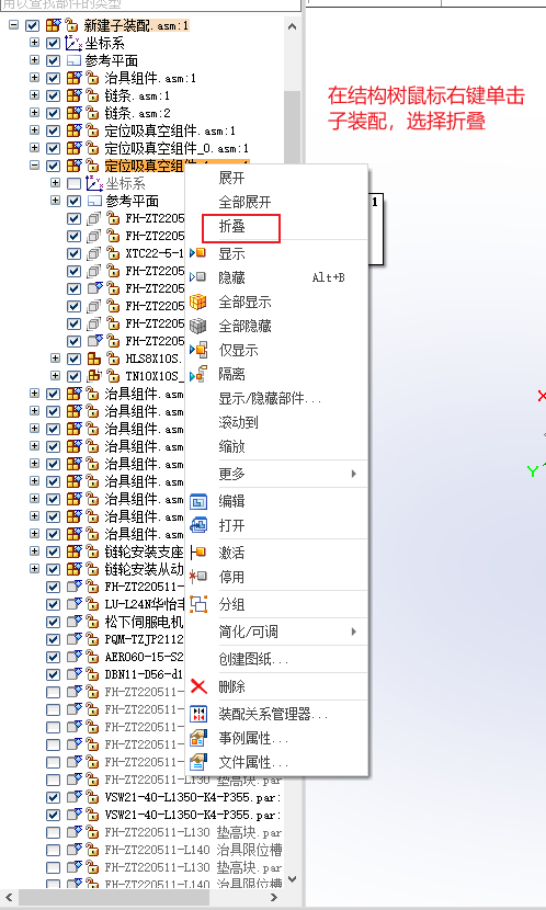 在结构树鼠标右键单击子装配,选择折叠