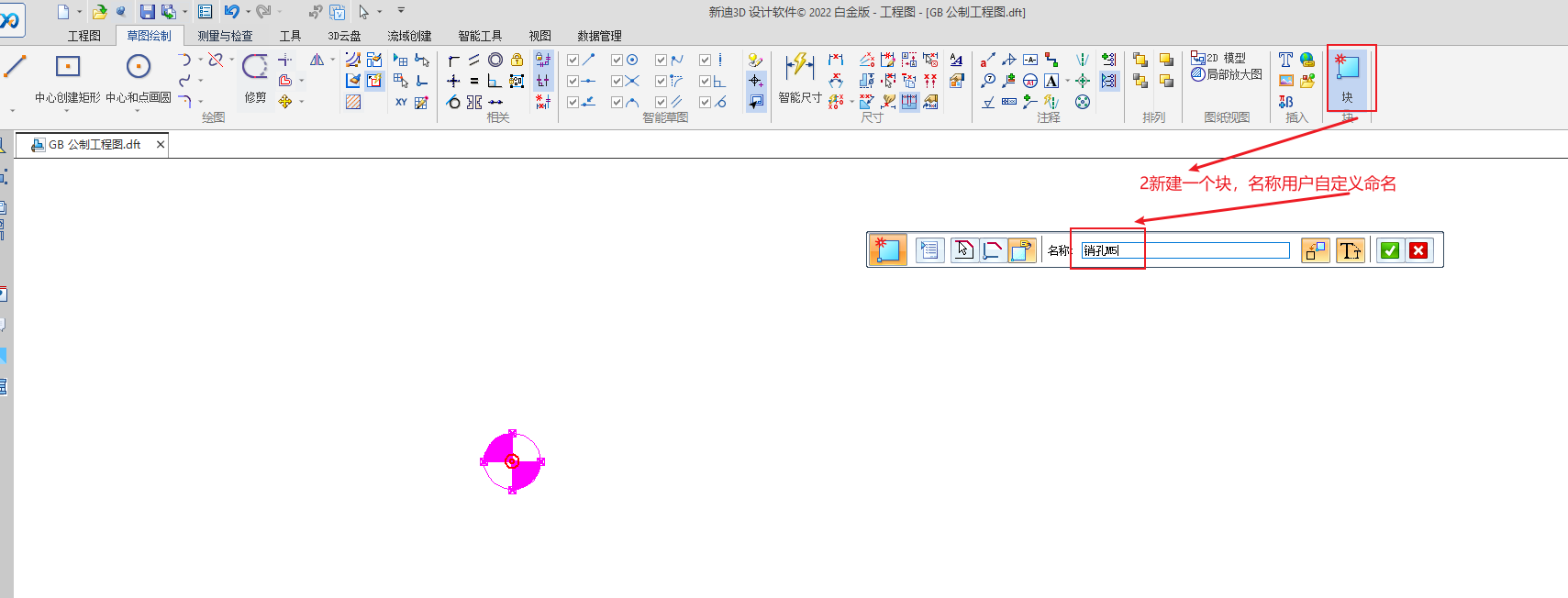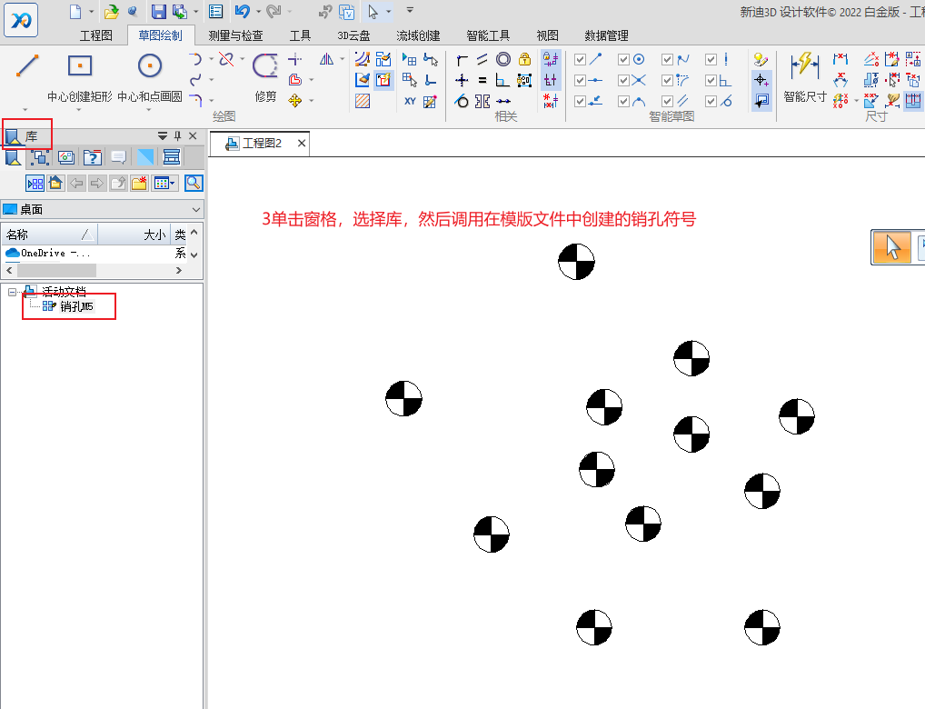 打开工程图模版,绘制一个销孔符号,单击创建块,然后关闭并保存工程图图模版,新建一个工程图,单击窗格,打开库,就可以调用在模版文件中创建销孔符号了,对于不同型号的销孔,用户目前只能手动去创建。