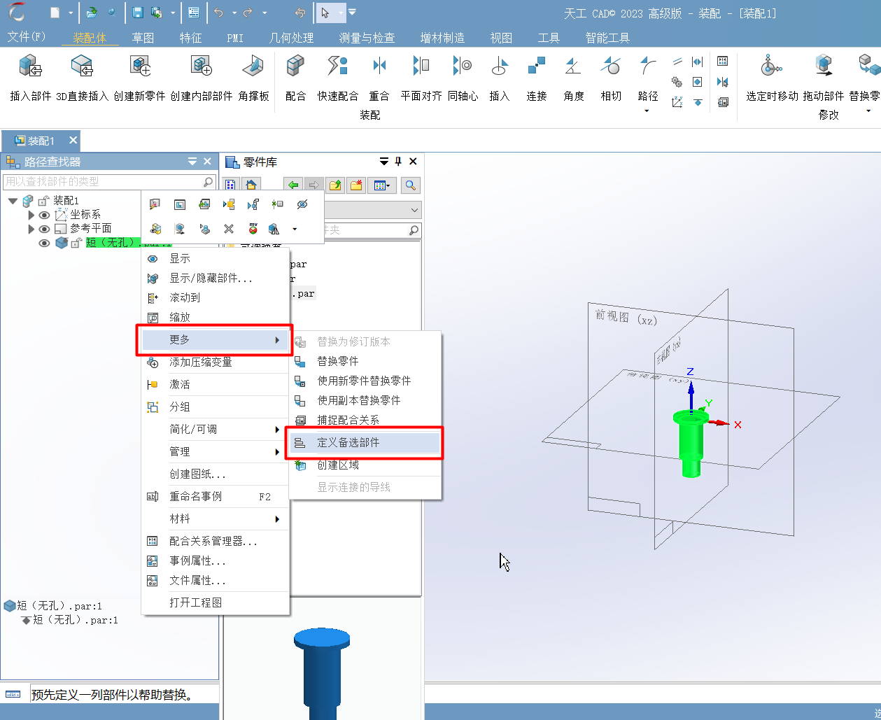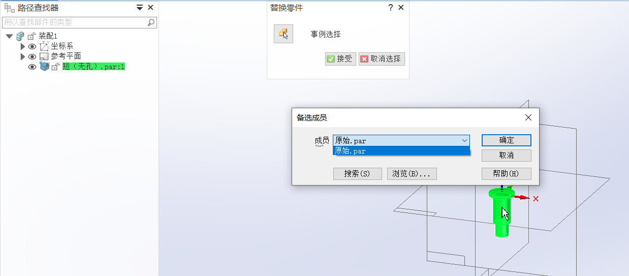 需要将零件族成员单独保存为独立零件,在装配体中插入其中一个成员文件,再定义备选部件,即可在替换部件时,出现备选项,快速切换成员配置